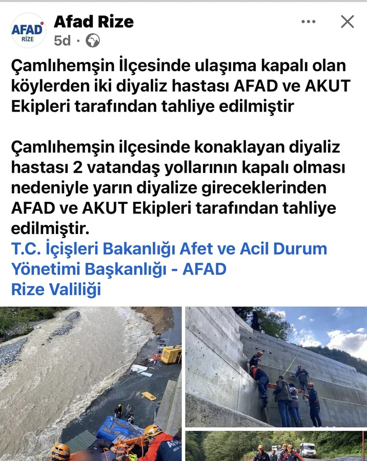 Başarıyla tamamlanan operasyonun ardından vatandaşlar, diyaliz seanslarına yetişebilmek için ilçe merkezine götürüldü. T.C. İçişleri Bakanlığı Afet ve Acil Durum Yönetimi Başkanlığı - AFAD Rize Valiliği, özverili çalışmalarından dolayı ekiplere teşekkür etti.