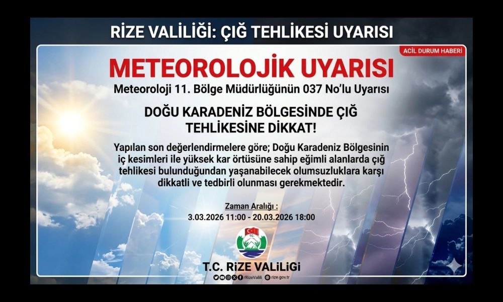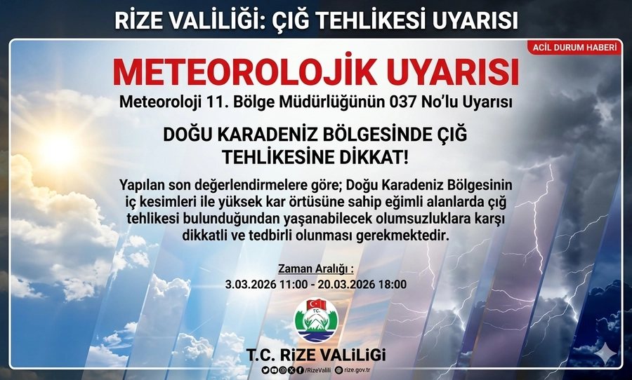 Rize Valiliği ve Meteoroloji 11. Bölge Müdürlüğü, Doğu Karadeniz Bölgesi genelinde yaşanabilecek olası olumsuzluklara karşı vatandaşları acil koduyla uyardı. Yapılan son meteorolojik değerlendirmelere göre, bölgenin iç kesimlerinde ve yüksek kar örtüsüne sahip eğimli arazilerde çığ tehlikesi en üst seviyeye ulaştı.