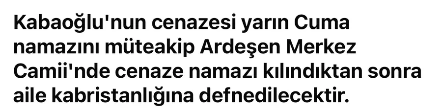 Ardeşen Ziraat Odası Başkanı Turan Kabaoğlu’nun abisi olan Hüseyin Avni Kabaoğlu’nun cenazesi akşam saatlerinde Ankara’dan memleketine getirilecek.