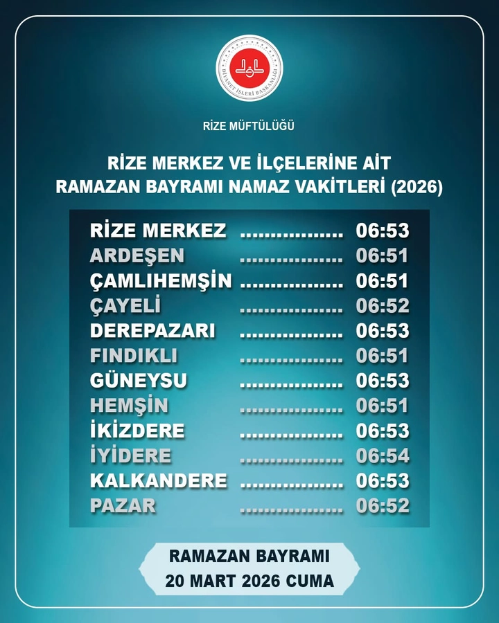 Rize Müftülüğü, 20 Mart 2026 Cuma günü kutlanacak olan Ramazan Bayramı için il merkezi ve ilçelerdeki namaz vakitlerini duyurdu. Bölge halkının bayram namazı hazırlıklarını yapabilmesi adına paylaşılan listede, güneşin doğuş vaktine göre ilçeler arasında küçük zaman farkları bulunuyor.