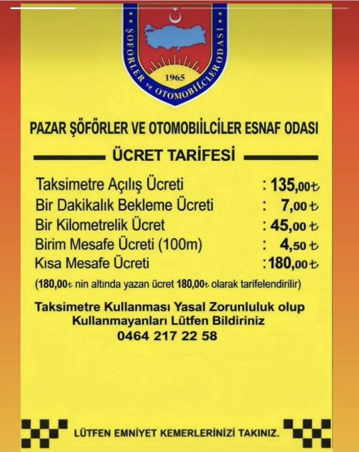 Rize’nin Pazar ilçesinde taksi ücret tarifesi güncellendi. Pazar Şoförler ve Otomobilciler Esnaf Odası tarafından açıklanan yeni tarifeye göre taksimetre ücretlerinde artışa gidildi.