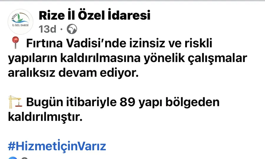 Rize İl Özel İdaresi'nin sosyal medya paylaşımına göre, Fırtına Vadisi'nde doğal güzelliklerin korunması ve can güvenliğinin sağlanması amacıyla izinsiz ve riskli yapıların kaldırılmasına yönelik çalışmalar aralıksız devam ediyor.