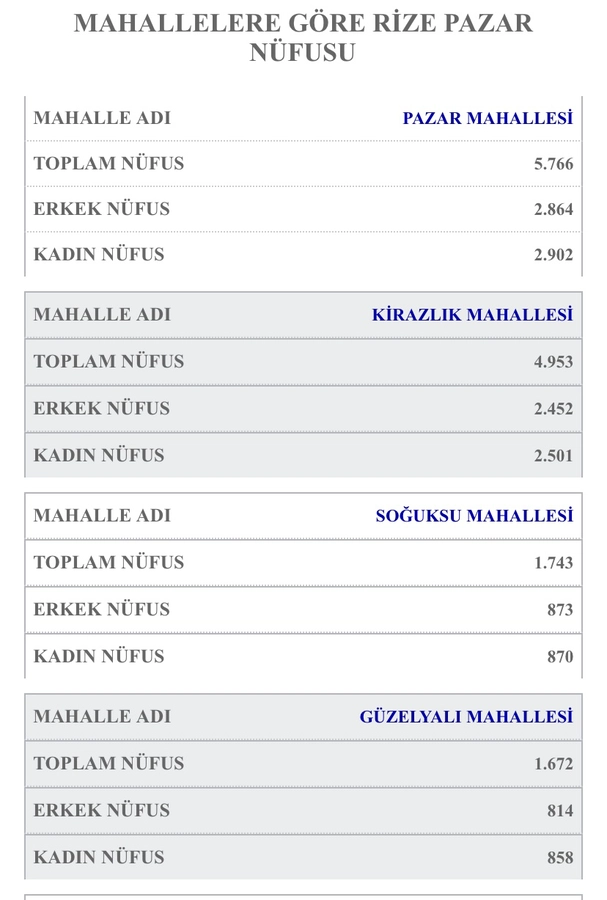 PAZAR NÜFUSU, RİZE 2026 - 2025 PAZAR nüfusu ne kadar, PAZAR bağlı köy ve mahalleler ve nüfus bilgileri