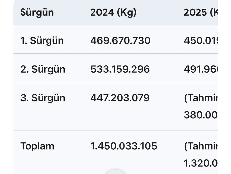 Başkan Erdoğan'ın verdiği bilgilere göre, 2024 yılına kıyasla 2025 yılı yaş çay rekoltesinde yaklaşık %20 oranında bir düşüş meydana geldi. Toplam rekoltenin tahmini olarak 1.310 - 1.320.000.000 kg civarında olması bekleniyor.