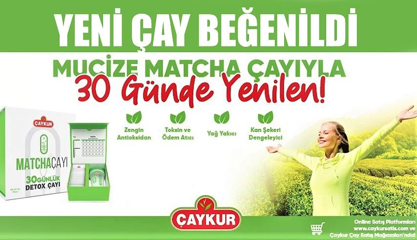 ÇAYKUR; MATCHA detoks çayı düzenli şekilde tüketildiğinde, vücuttan toksinlerin atılması ve temizlenmesi anlamına gelmektedir. Uzmanlar detoks uygulamanın vücuda faydalı olduğunu belirtmektedir ve en az yılda 1-2 kez mutlaka detoks yapılmasını önermektedir. Bunun nedeni vücudu alıştığı beslenme tarzına karşı savunmaya alarak şaşırtması ve harekete geçmesini sağlamasıdır. Fit kalmak isteyenlerin, vücudunda birikmiş olan yağları çözülmesi ve vucüdün çorba, yoğurt, süt ve salatalarında bir çay kaşığı, tüm pastane ürünlerinde, dondurmalarda kilogram başına bir çay kaşığı ile pasta kurabiyelerde kilogram başına bir tatlı kaşığı kullanmalıdır. Çay satış mağazalarında tüketicilerin beğenisine sunulan Matcha çayının kutusunda çayın hazırlanacağı aparatta beraberinde bulunuyor. Uzmanlar; Sağlık kaynağı Matchaçayı L-theanine yeşil çay yapraklarından elde edilen bir amino asittir. Aynı zamanda yeşil çaya aromasını veren maddedir. L- theanine uykuyu düzenler ve rahatlık hissi sağlar. Bağışıklık sisteminin güçlenmesine katkıda bulunur. Konsantrasyonu arttırır. Bağışıklık sistemini güçlendirir. Hücre yenileyici özelliği vardır. Tansiyon ve kolesterolü düşürür. Çok güçlü bir antioksidandır. Kanserle savaşmaya yardımcı olur. Yeşil Çay pudrası içeriğinde K, B1 ve B2 vitaminleri bulunmaktadır. C vitamini kaynağı olan yeşil çay, E vitamini açısından da çok zengin bir bitki olup, aktif madde olarak kateşinler ve polifenoller içerir. Vücutta detoks etkisi yaparak, kilo vermeye yardımcı olur. Diyabeti kontrol altına almaya yardımcı olur. Toksin ve ödem attırır, metabolizmayı hızlandırır. Enfeksiyonlara karşı korur. Cildi yeniler ve güzelleştirir. Sindirimi kolaylaştırır. Enerji verir, şeklinde tüketiciler bilgilendirildi.