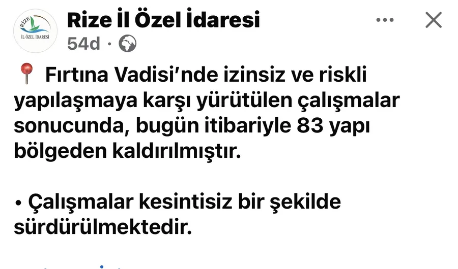 İl Özel İdaresi’nin kamuoyuyla paylaştığı mesajda, çevre ve doğal dokunun korunması amacıyla gerçekleştirilen operasyonlara vurgu yapıldı. Yapılan açıklamada, “Fırtına Vadisi’nde izinsiz ve riskli yapılaşmaya karşı yürütülen çalışmalar sonucunda, bugün itibariyle 83 yapı bölgeden kaldırılmıştır” ifadeleri yer aldı.