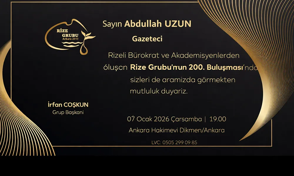 2010 yılında Ankara’da Rizeli bürokrat ve akademisyenlerin öncülüğünde kurulan Rize Grubu, kuruluşundan bu yana sürdürdüğü birlik ve dayanışma geleneğini 200’üncü buluşma yemeğiyle taçlandırmaya hazırlanıyor. Rize Grubu’nun 200’üncü yemeği, 7 Ocak 2026 Çarşamba günü saat 19.00’da Ankara Hakimevi Dikmen’de gerçekleştirilecek.