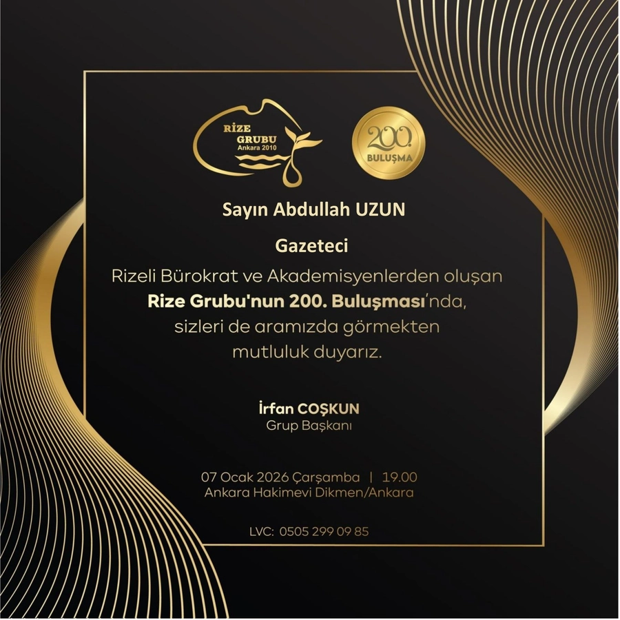 Rize Grubu Başkanı İrfan Coşkun imzasıyla iletilen davetiyede, grubun bugüne kadar gerçekleştirdiği çalışmalara basın yoluyla katkı sunan isimlerin önemine vurgu yapılarak, Abdullah Uzun’un 200’üncü buluşmada aralarında görülmesinden mutluluk duyulacağı ifade edildi.