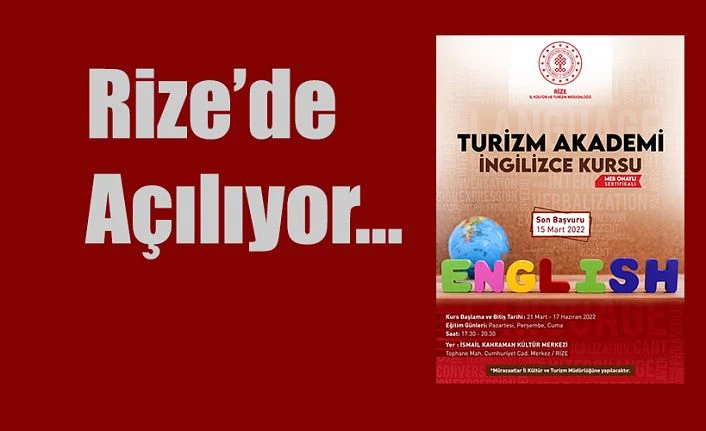 Yapılan açıklamada ;İl Kültür ve Turizm Müdürlüğü tarafından “Turizm Akademi” projesi kapsamında, Rize Halk Eğitim Merkezi Müdürlüğü desteğiyle MEB onaylı sertifikalı İngilizce kursu açılacak. Başlangıç seviyesinde yapılacak olan kurs 21 Mart - 17 Haziran 2022 tarihleri arasında Pazartesi, Perşembe ve Cuma günleri 17:30 - 20:30 saatleri arasında gerçekleştirilecek.'ifadelerine hyer verildi.
