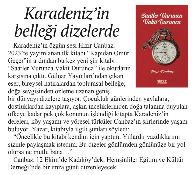 Karadeniz’in özgün sesi Hızır Canbaz, 2023’te yayımlanan ilk kitabı “Kapıdan Ömür Geçer”in ardından, bu kez yeni şiir kitabı “Saatler Vurunca Vakit Durunca” ile okurlarının karşısına çıktı. Gülnar Yayınları’ndan çıkan ve bireysel hatıralardan toplumsal belleğe, doğa sevgisinden özleme uzanan geniş bir dünyayı dizelere taşıyan eser, büyük ilgi gördü.