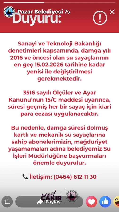 Pazar Belediyesi tarafından yapılan açıklamada, Sanayi ve Teknoloji Bakanlığı denetimleri kapsamında, damga süresi dolmuş su sayaçlarının en geç 15 Şubat 2026 tarihine kadar yeni sayaçlarla değiştirilmesinin zorunlu olduğu belirtildi.