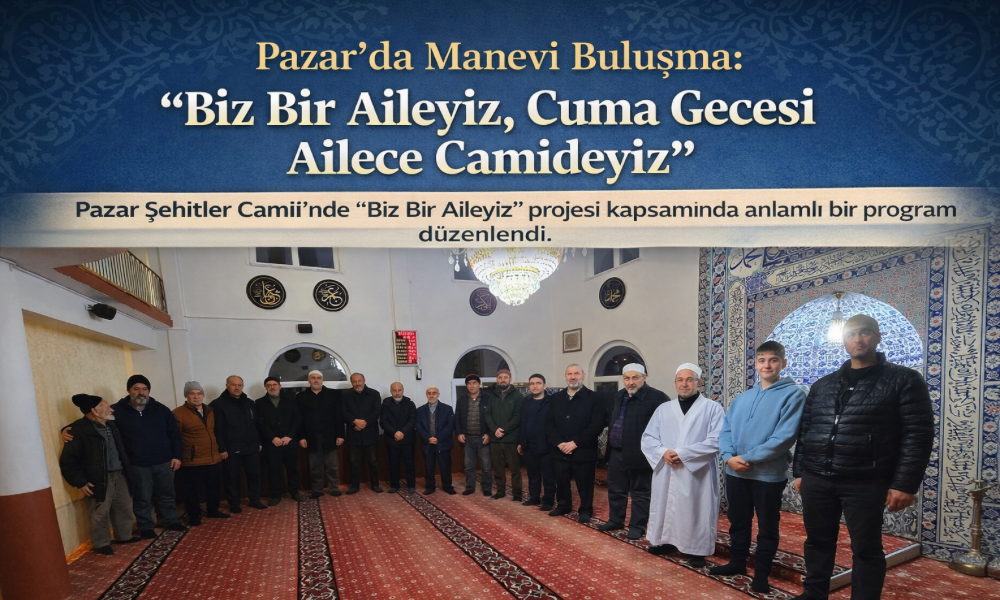 Rize’nin Pazar ilçesinde toplumun manevi değerlerini güçlendirmeye yönelik önemli bir buluşma gerçekleştirildi. Pazar İlçe Müftülüğü koordinesinde yürütülen “Biz Bir Aileyiz, Cuma Gecesi Ailece Camideyiz” projesi kapsamında Cumhuriyet Mahallesi Şehitler Camii’nde düzenlenen programa vatandaşlar yoğun ilgi gösterdi.
