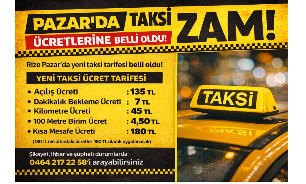 Rize’nin Pazar ilçesinde taksi ücret tarifesi güncellendi. Pazar Şoförler ve Otomobilciler Esnaf Odası tarafından açıklanan yeni tarifeye göre taksimetre ücretlerinde artışa gidildi.