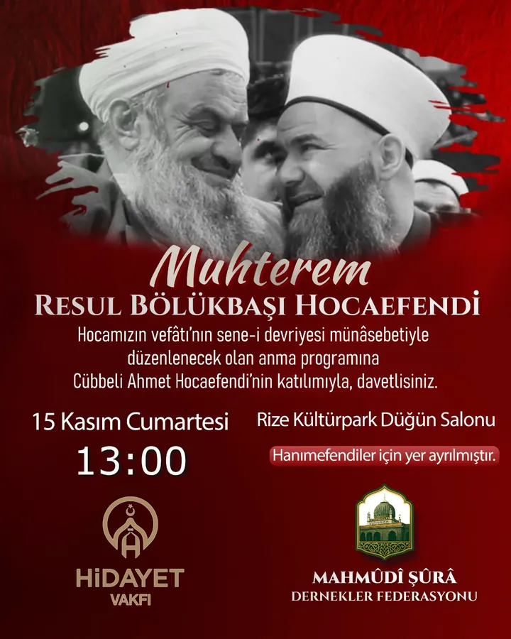 15 Kasım Cumartesi günü saat 13.00’te Rize Kültürpark Düğün Salonu’nda gerçekleştirilecek anma programı, Hidayet Vakfı ve Mahmûdî Şûrâ Dernekler Federasyonu tarafından organize ediliyor. Programa Cübbeli Ahmet Hocaefendi de katılacak.