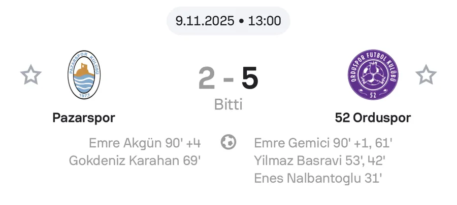 Karşılaşma rakip takım 52 Orduspor F.K nın 5-2 galibiyeti ile sona erdi.