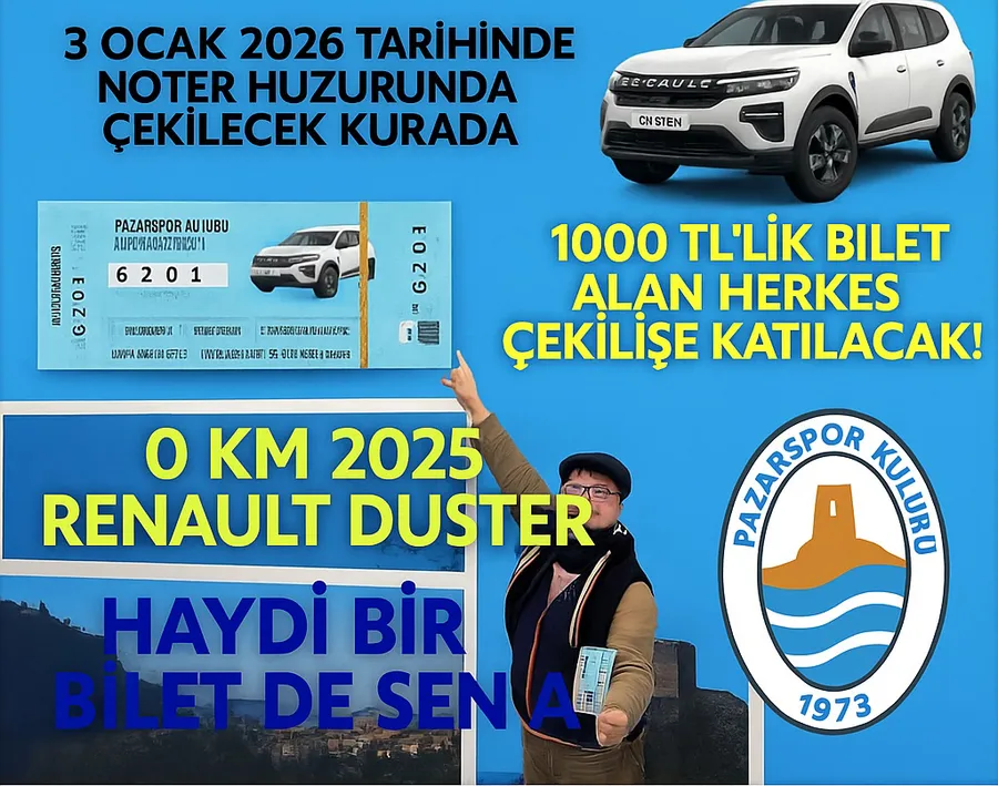 Piyango kapsamında 0 kilometre 2025 model Renault Duster otomobil hediye edilecek. Çekiliş, 3 Ocak 2026 tarihinde noter huzurunda gerçekleştirilecek.