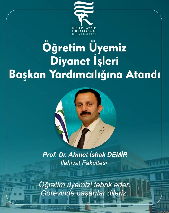 Prof. Dr. Ahmet İshak Demir’in yeni görevinin kendisine, Diyanet İşleri Başkanlığı camiasına ve ülkemize hayırlı olmasını diliyor; Üniversitemiz adına kendisini tebrik ediyor, başarılarının devamını temenni ediyoruz. Atama, Rize'de sevinçle karşılandı.