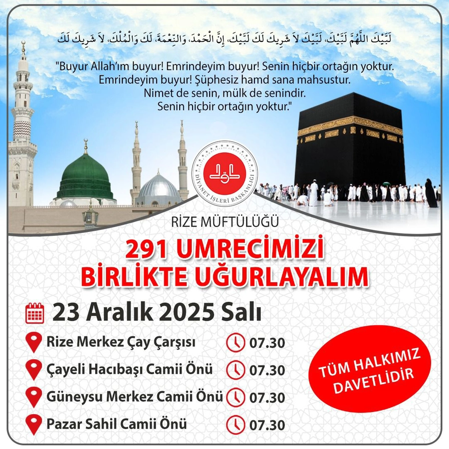 Rize Müftülüğü tarafından yapılan davette, umre yolculuğuna çıkacak vatandaşların bu manevi heyecanına ortak olmak isteyen tüm halkın programa davetli olduğu bildirildi.