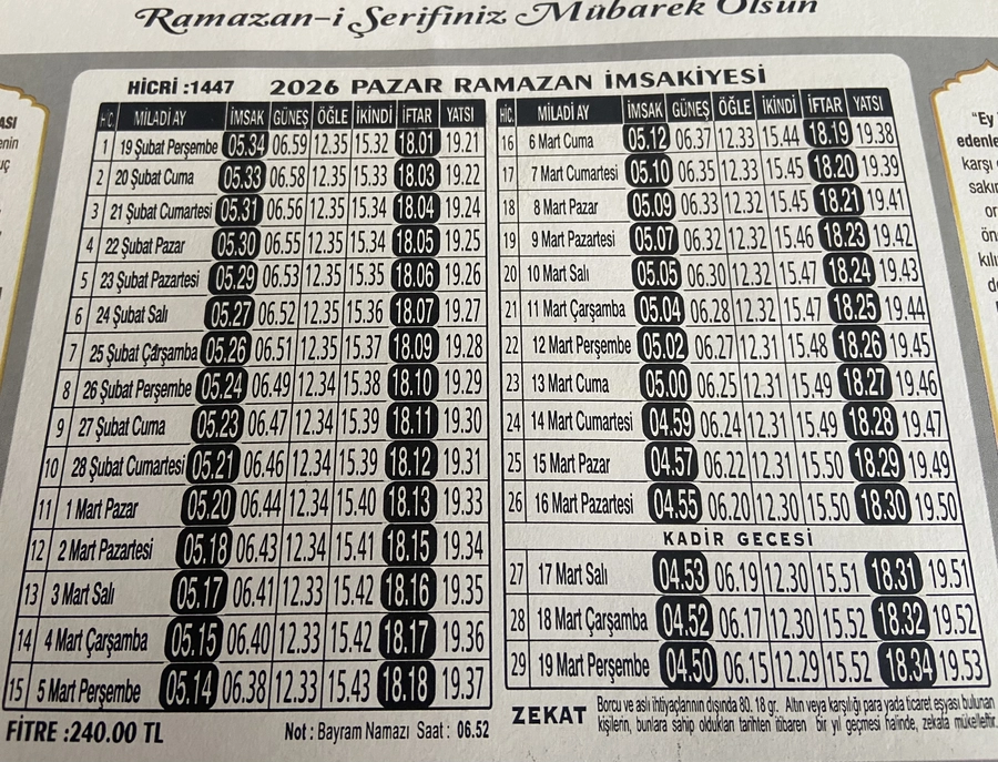 RİZE -Rize’nin Pazar ilçesinde 2026 yılı Ramazan ayına ilişkin imsak vakitleri belli oldu. Hicri 1447 yılına denk gelen Ramazan ayı, 19 Şubat 2026 Perşembe günü başlayacak.