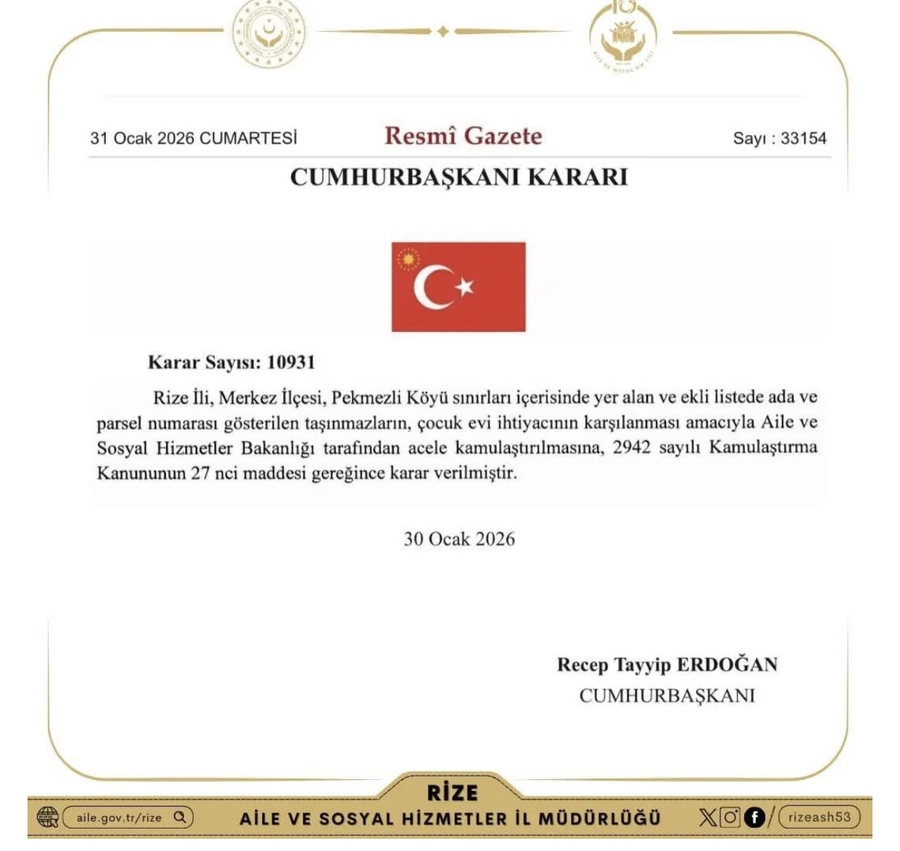 Rize ili Merkez ilçesine bağlı Pekmezli Köyü sınırları içerisinde yer alan bazı taşınmazlar için acele kamulaştırma kararı alındı. Çocuk evi ihtiyacının karşılanması amacıyla alınan karar, Resmî Gazete’de yayımlanarak yürürlüğe girdi.