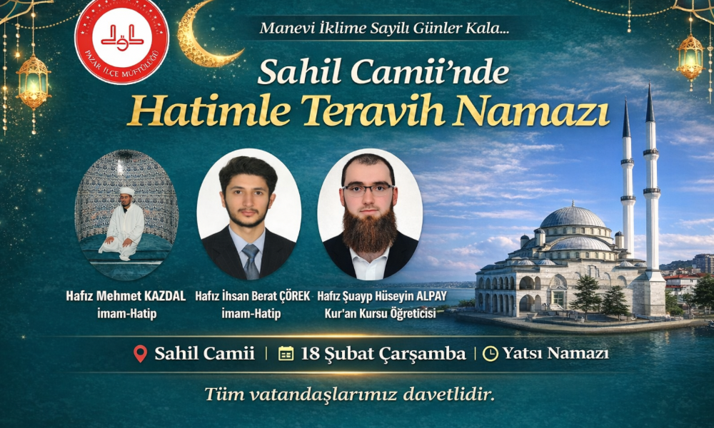PAZAR – Ramazan ayının manevi atmosferi yaklaşırken, Pazar İlçesi Sahil Camii’nde anlamlı bir program düzenleniyor. İlçe Müftülüğü koordinesinde gerçekleştirilecek olan Hatimle Teravih Namazı, 18 Şubat Çarşamba günü akşamı Sahil Camii’nde kılınacak.