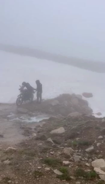 Adil Çatan ise “Hava koşulları olumsuz olmasına rağmen dört motorcu olarak Horon Boğazı Zirvesi ve Palovit Yayla Zirvesini aştıktan sonra Samistal Yaylasına ulaştık. Erimeyen karlarıyla türkülere bile konu olan Samistal Boğazı bizi yine erimeyen karları ve yoğun sisi karşıladı” diye konuştu