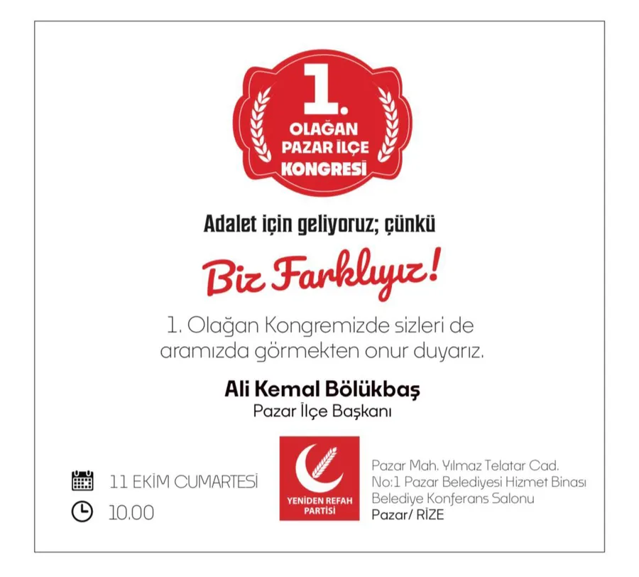 Kongre, 11 Ekim Cumartesi günü saat 10.00'da, Pazar Mahallesi Yılmaz Telatar Caddesi'nde bulunan No:1 Pazar Belediyesi Hizmet Binası Belediye Konferans Salonu'nda gerçekleştirilecek. Parti, kongre davetinde "Adalet için geliyoruz; çünkü Biz Farklıyız!" sloganını kullandı.